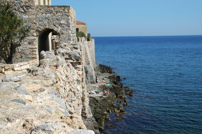 Ο κύριος Αρδάμης που με είχε φιλοξενήσει στους υπέροχους ξενώνες του, με ξενάγησε μέσα στο Κάστρο και με πήγε στην παραλία που κάνουν βουτιές όσοι μένουν εκεί! Η μοναδική θαλασσινή πύλη της Μονεμβασιάς, το Πορτέλο, ανοίγει στη μέση του τείχους, για να κάνετε βουτιά στα κρυστάλλινα νερά. Η αίσθηση; Σαν να πηδάτε από την κουπαστή του πλοίου. Κολύμπι με φόντο τον γκρίζο βράχο και τα εντυπωσιακά πέτρινα κτίσματα που αναπαύονται στη ράχη του. Μια ανεπανάληπτη εμπειρία διακοπών, με φόντο έναν από τους ωραιότερους προορισμούς στην Ελλάδα.
